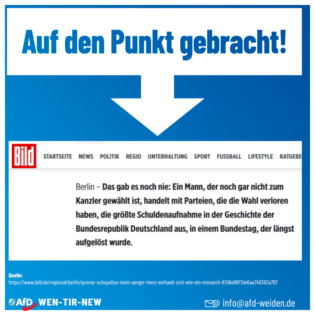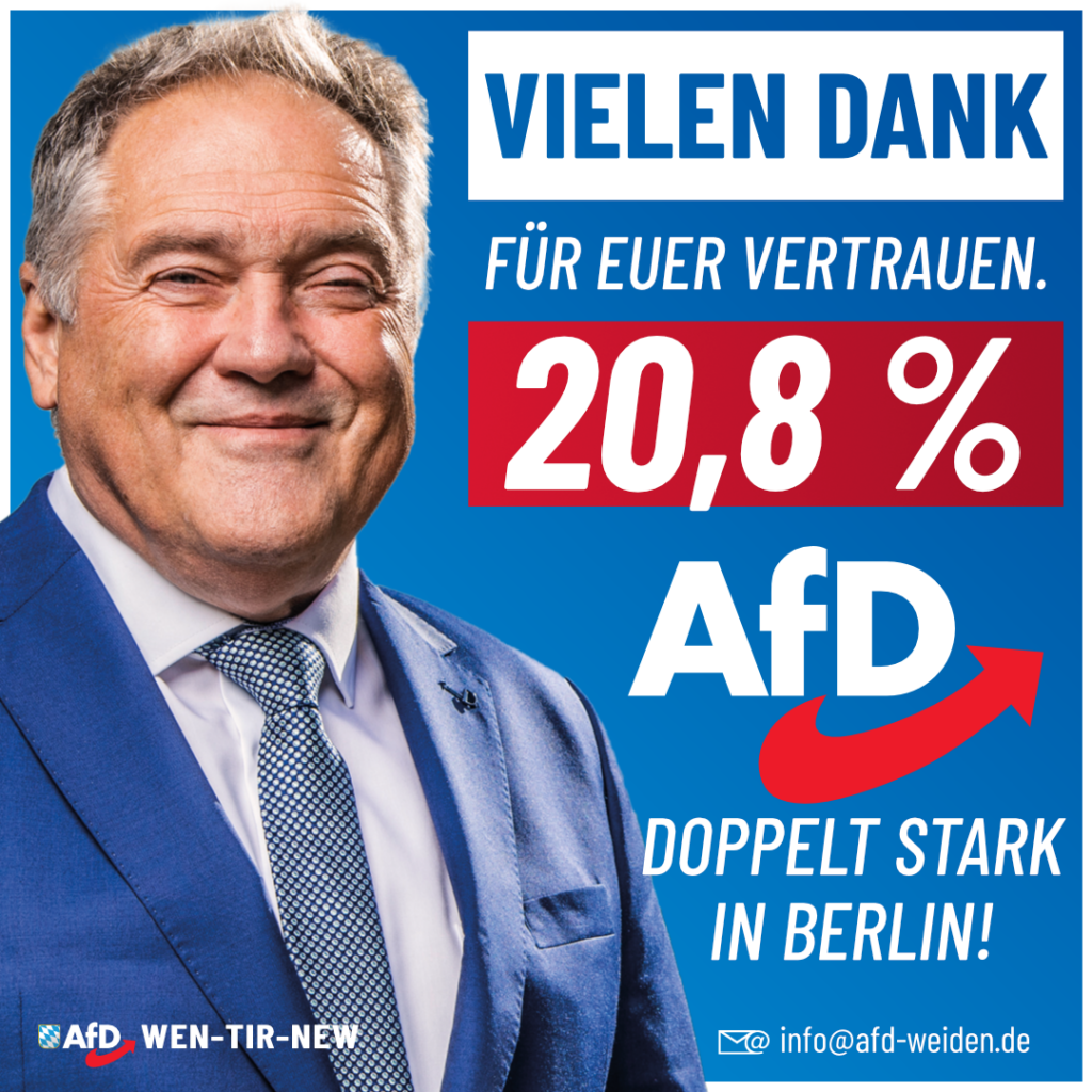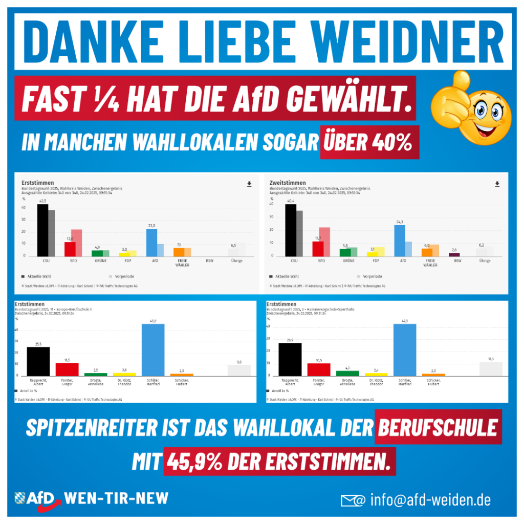 Nach einem kurzen, intensiven Wahlkampf haben wir in Weiden 23% der Erststimmen und 24,3% der Zweitstimmen erzielt – ein starkes Signal eurer Unterstützung. Bundesweit erreichte die AfD 20,8% und zeigt […]