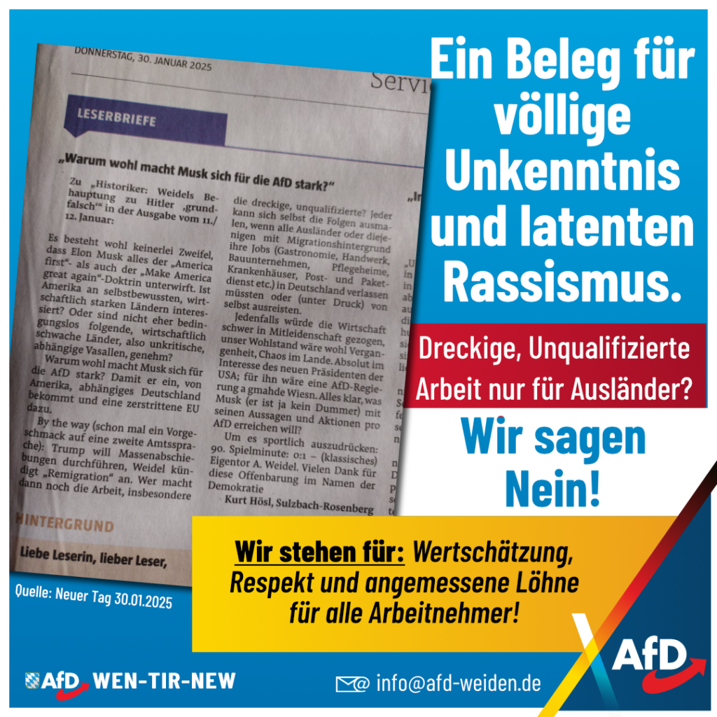 🇩🇪🔥 Heuchelei entlarvt! 🔥🇩🇪 Ein Leserbrief im Neuen Tag vom 30.01.2025 behauptet, Elon Musk wolle Deutschland mit der AfD wirtschaftlich abhängig machen – doch der Schreiber selbst entlarvt seine eigene […]