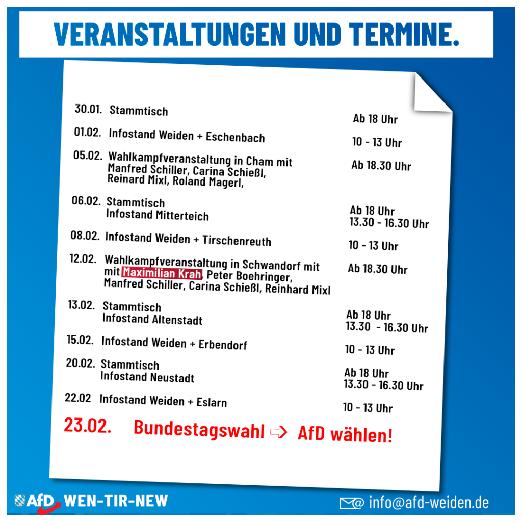 Unsere Termine bis zur Bundestagswahl. Teilt den Beitrag mit Freunden, Bekannten und Verwandten. Kommt zu uns und informiert euch aus erster Hand. Denn so kann es nicht weitergehen. Am 23.02. […]