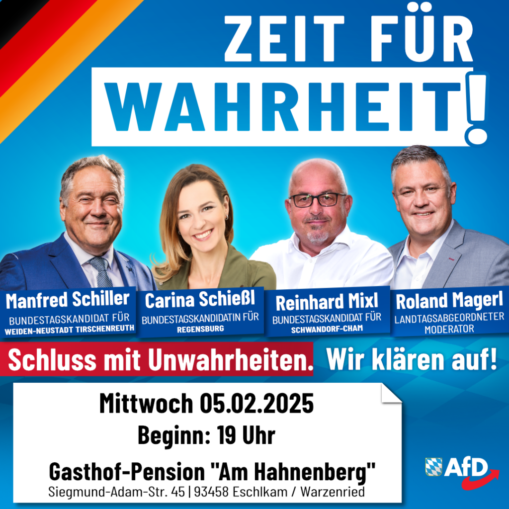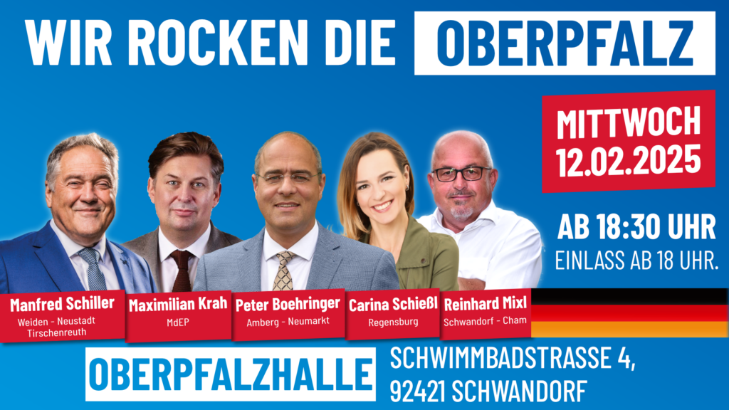 Infoabend mit: Maximilian Krah, Peter Boehringer, Manfred Schiller, Carina Schießl und Reinhard Mixl. Ab 18.00 in der Oberpfalzhalle in Schwandorf Schwimmbadstraße 4, 92421 Schwandorf